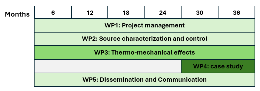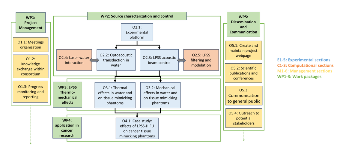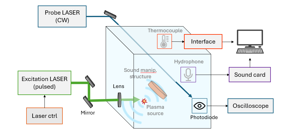 WP2 focuses on the core scientific development of the project. It involves setting up the experimental platform, studying how laser-plasma sound sources (LPSS) generate acoustic waves in water, and developing methods to control these waves (e.g., focusing, steering, and frequency tuning). Both experimental and computational approaches are used.